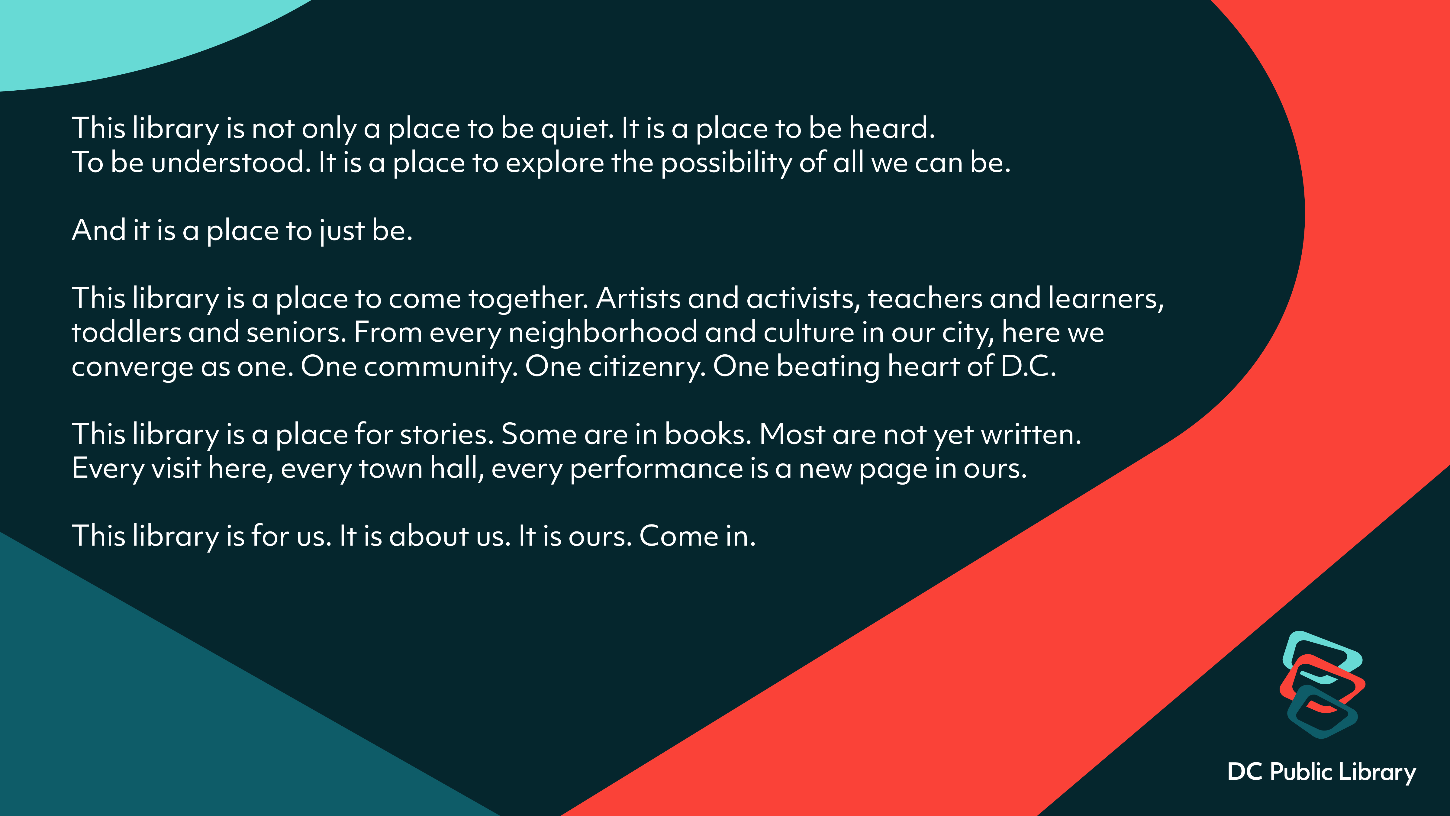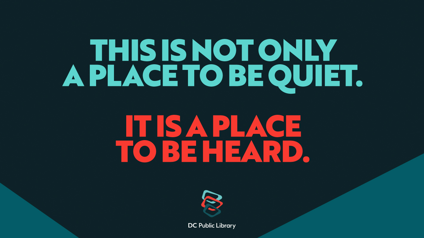 We quickly learned that the offerings at Washington, DC’s public libraries are as diverse and vibrant as the communities these libraries serve. From coworking space to storytime to concerts or simply safety and comfort, visitors use the libraries in myriad ways. The DC Public Library brand needed to both honor this diversity, and find a connective thread that would resonate across these audiences. Ultimately, that connection was a combination of ascendance and welcoming: DC Public Library is a place to explore the possibility of all you can be. And it is a place to just be. All are welcome.