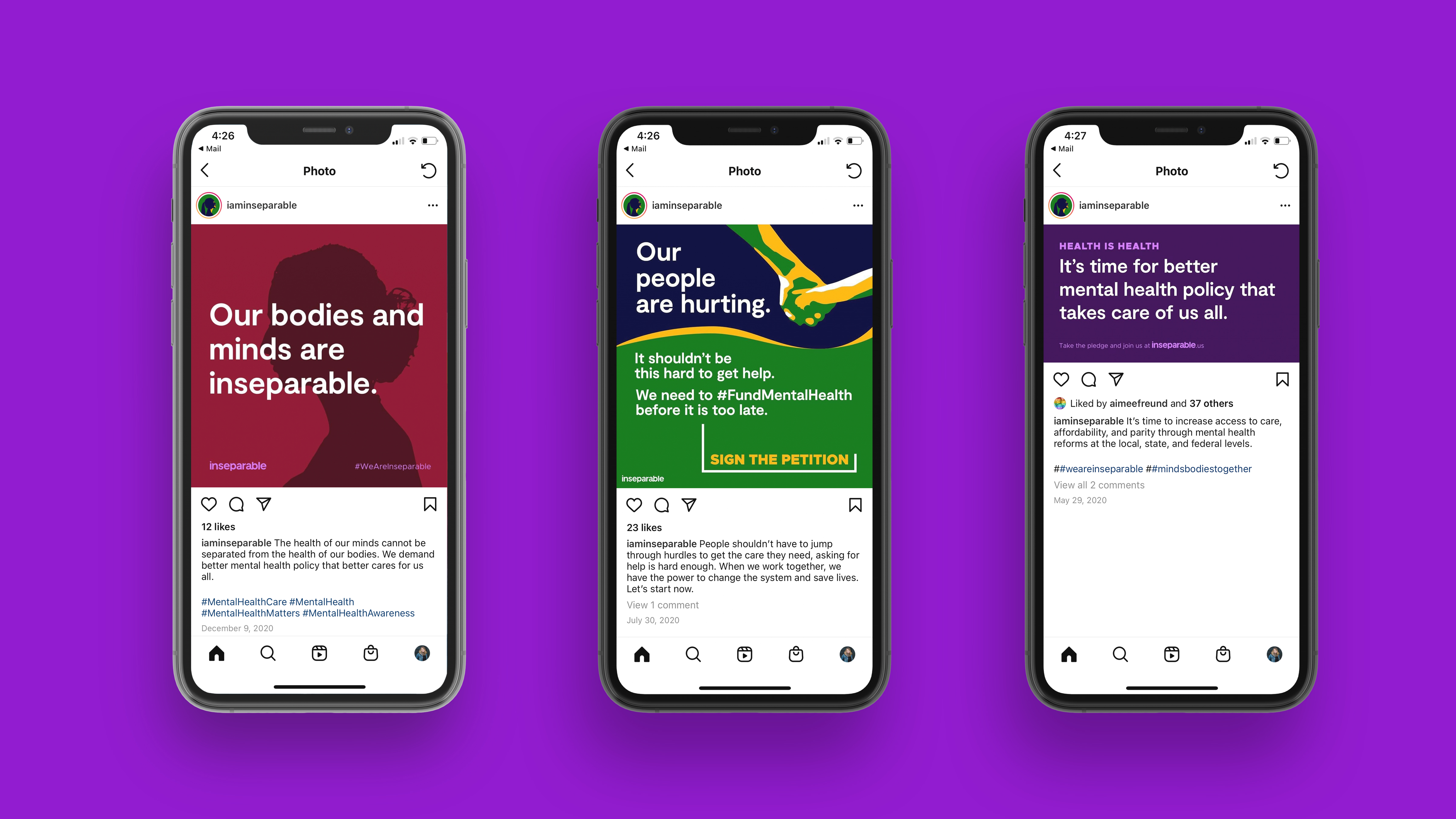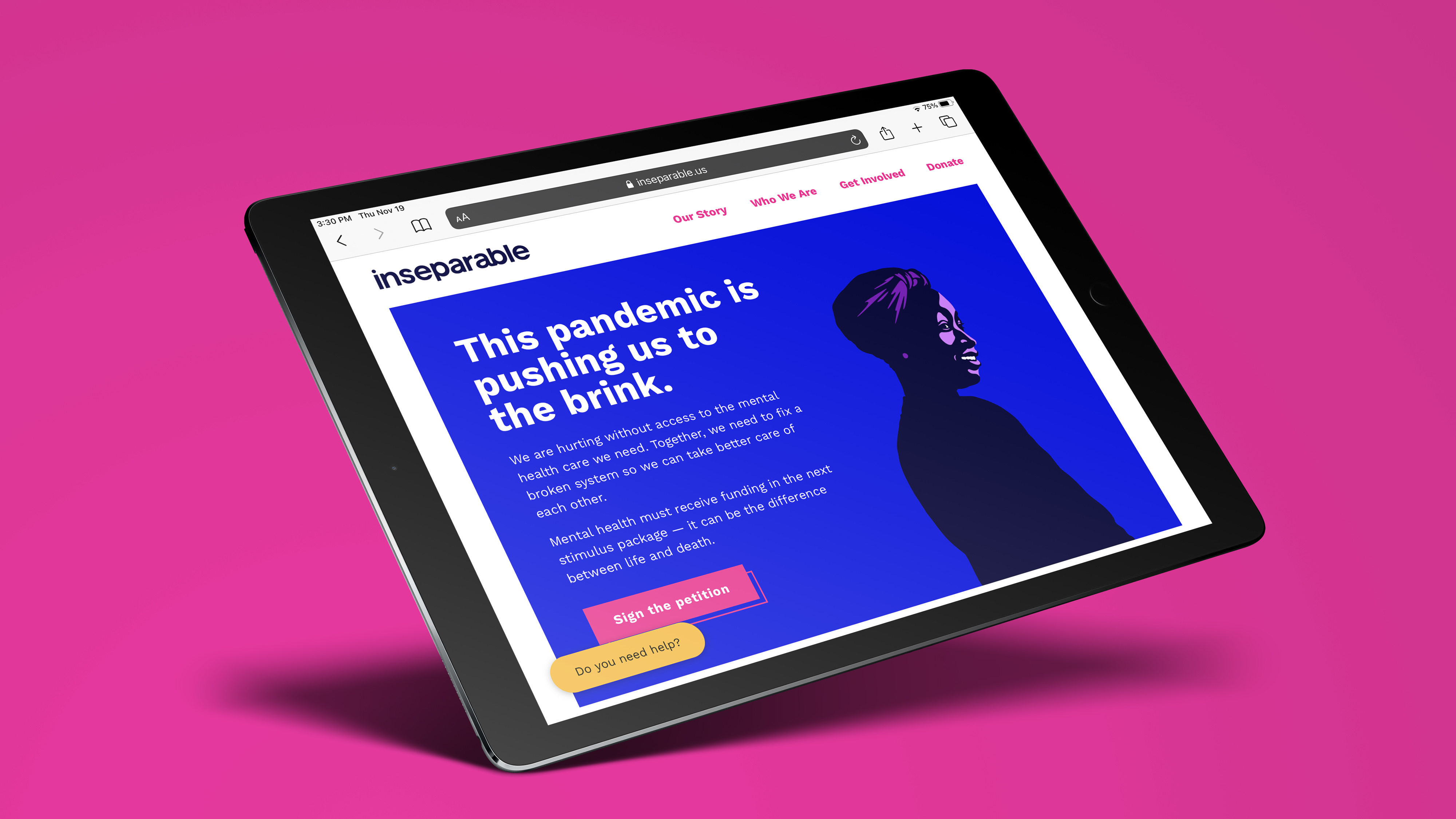 Despite widespread prevalence, mental health issues still remain stigmatized for many. To create a campaign that would make room for everyone impacted by mental health to feel safe championing the issue, Mighty Good grounded the brand in the concept of taking action to take care of others, an idea sparked by audience research. Inseparable would not be a “me” brand, but a “we” brand. The call to arms for the brand became: “We need to take better care of each other, and we need to do it right now: by demanding mental health policy that better cares for us all.”