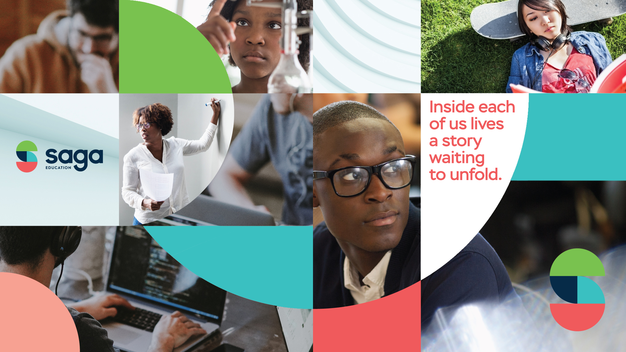 Saga Education is both of and for a diverse community of people -- particularly young tutors and students. As such, the organization needed a new visual identity system that was youthful, and celebrated the Black and Latinx young people at the core of Saga Education’s mission. The foundation of that design system is a multicolored abstract mural design that connects adults and youth through a bright, diverse, energetic pattern of shapes.