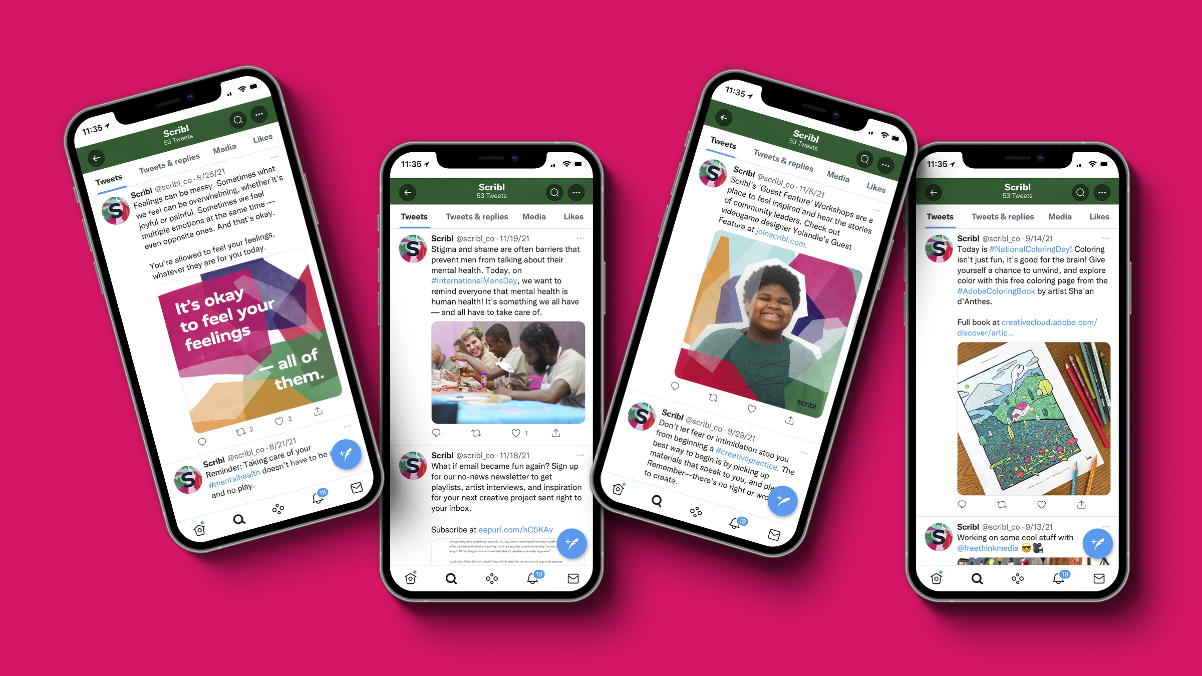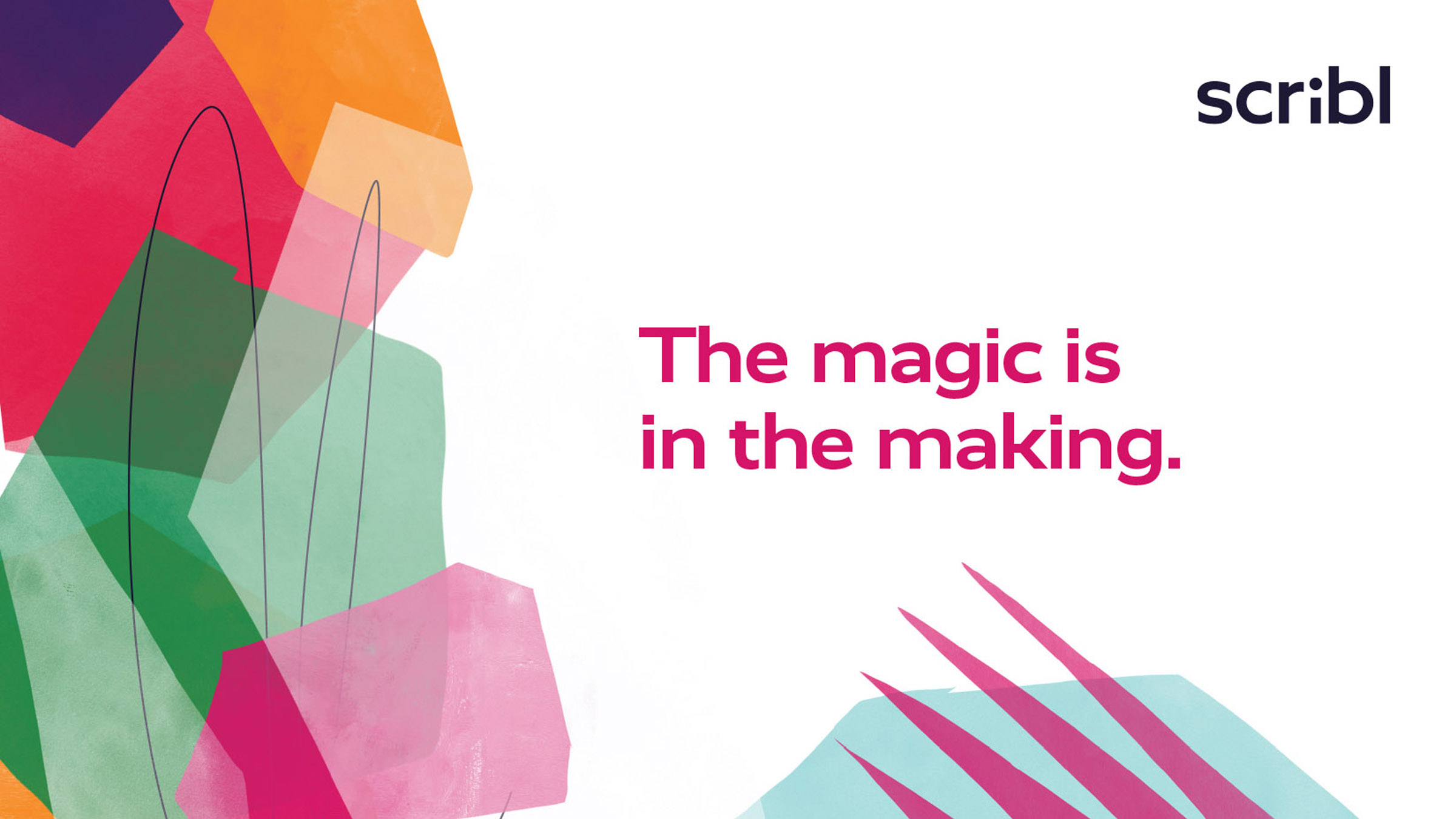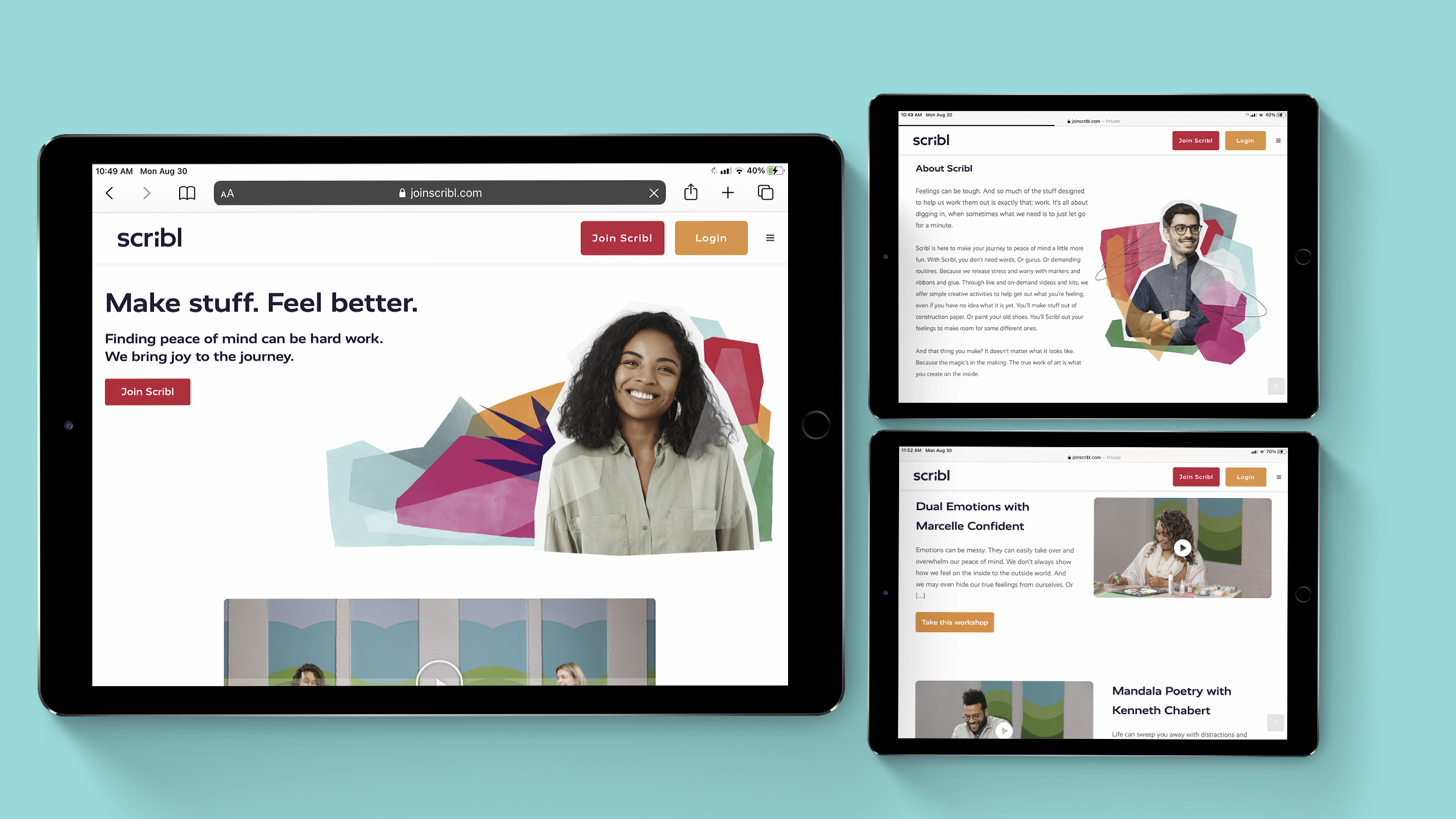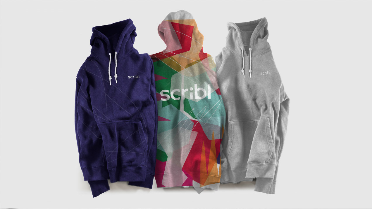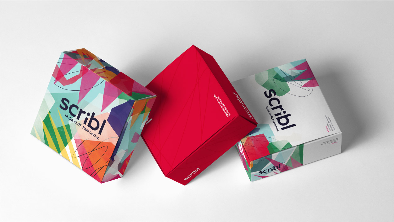 The Scribl visual identity system is designed to both celebrate the imperfection of human feelings, and the peace of mind that results from engaging with Scribl. To that end, the system consistently balances joyfully chaotic, colorful collage with a clean, simple logo, and can dial up or down the balance between chaos and calm to reflect a full spectrum of human emotion.