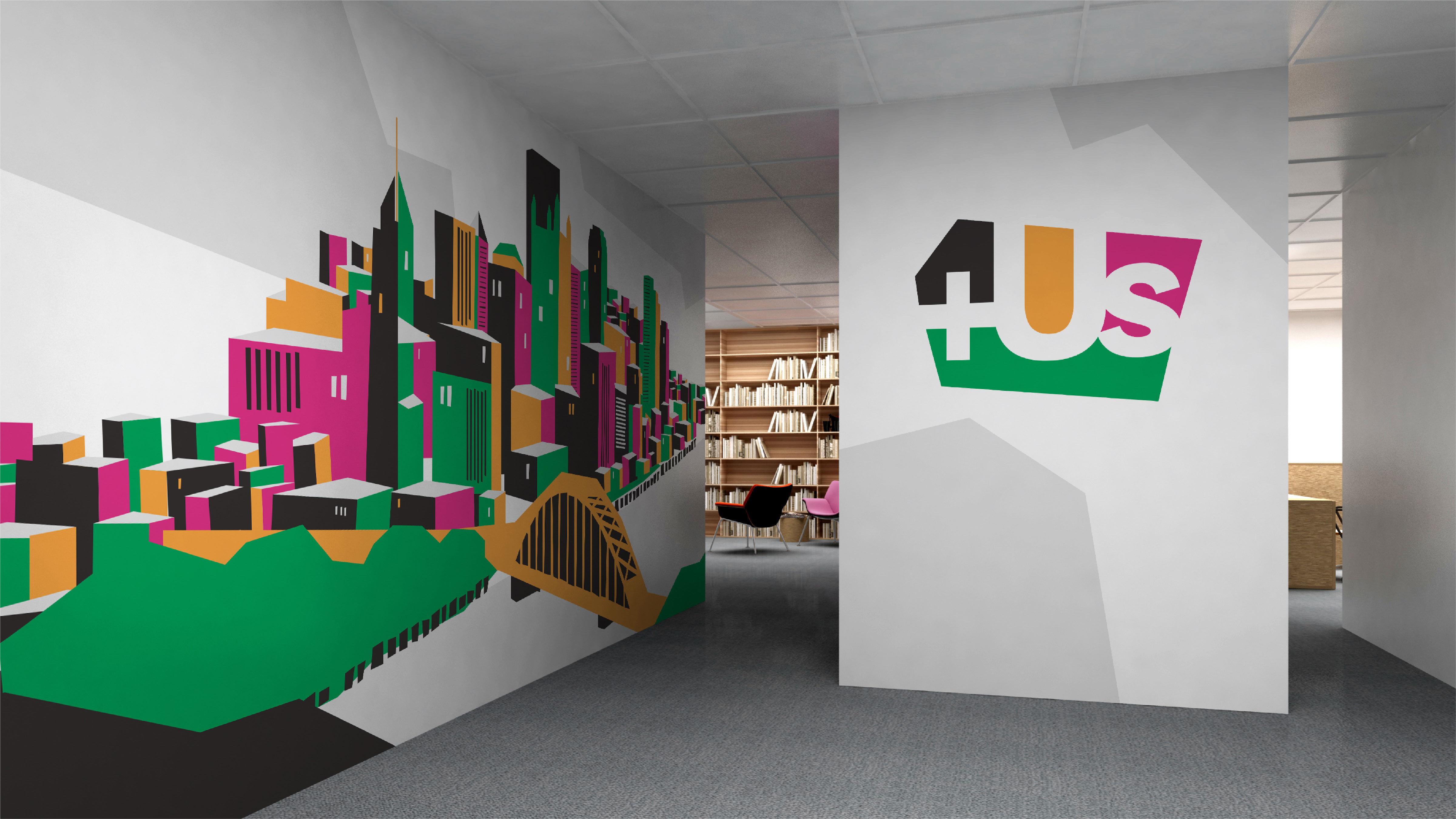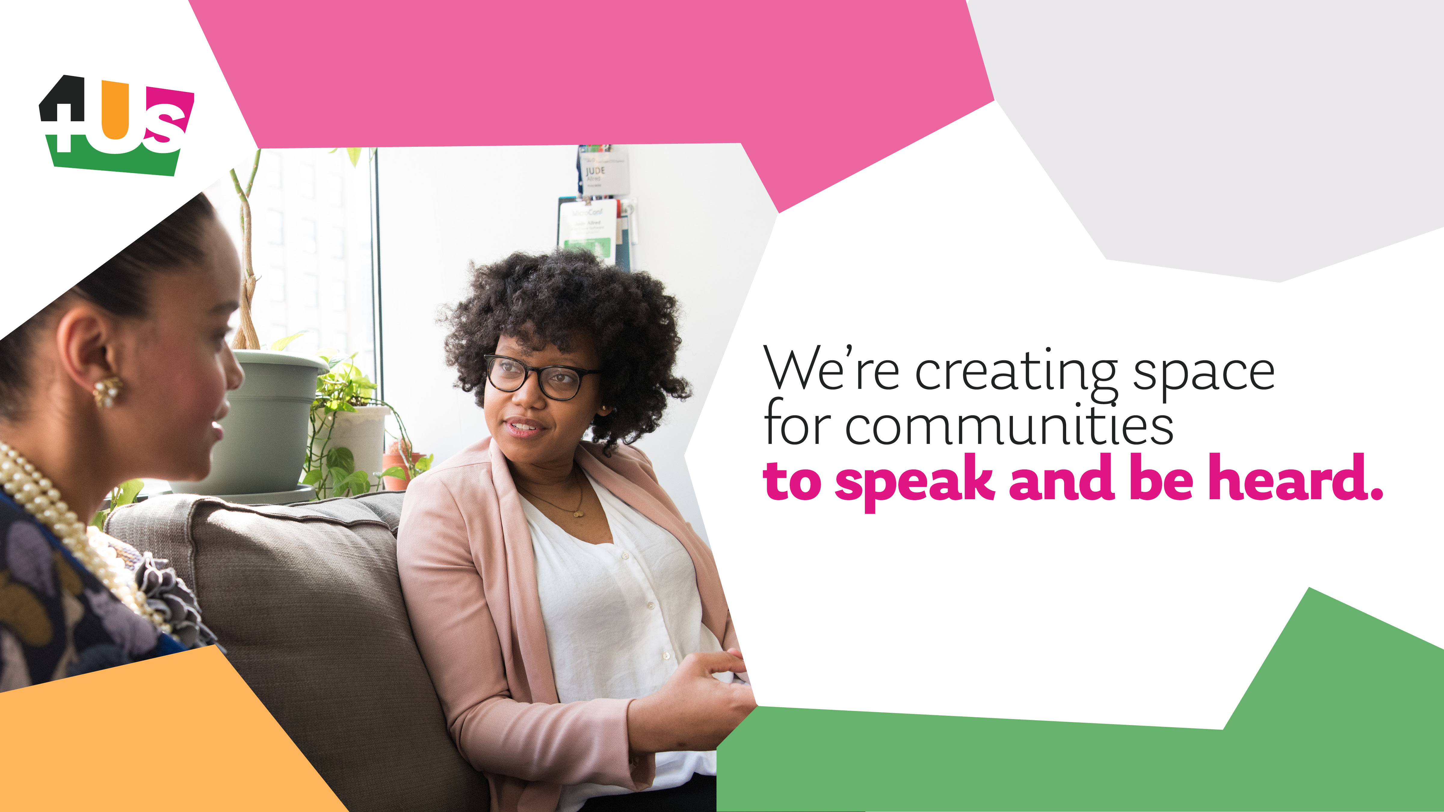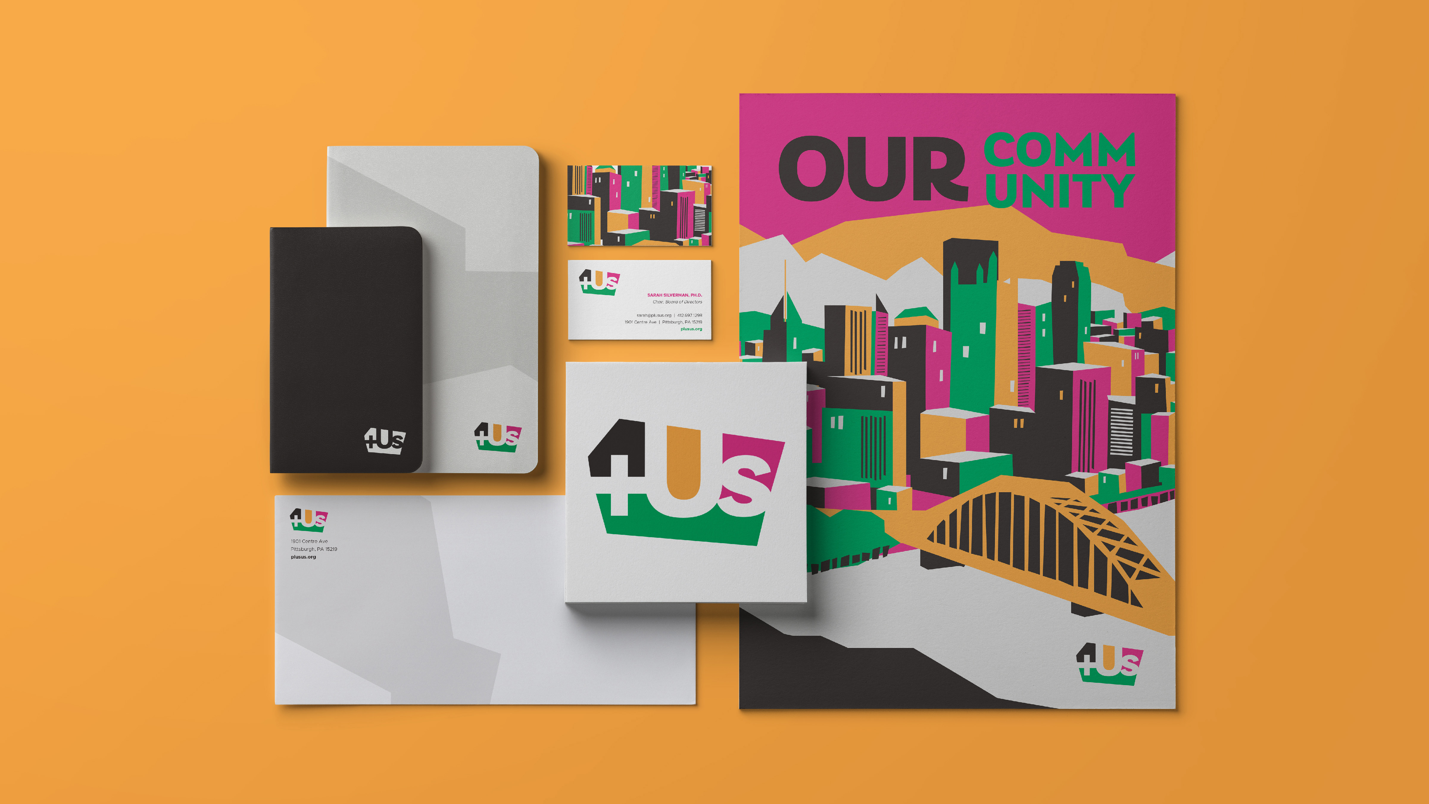 The +Us visual identity system is designed to celebrate the community of diverse voices that come together through +Us. To that end, the style is deliberately organic and colorful, composed of distinct shapes representing Pittsburgh’s different neighborhoods, communities, and cultures, as well as the intrinsic power and potential of each. In the +Us visual identity system, as in the organization’s work, these pieces come together to create a city that is vibrant and hopeful. One that Pittsburgh community members can all be part of. And proud of.